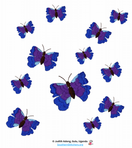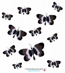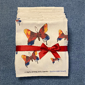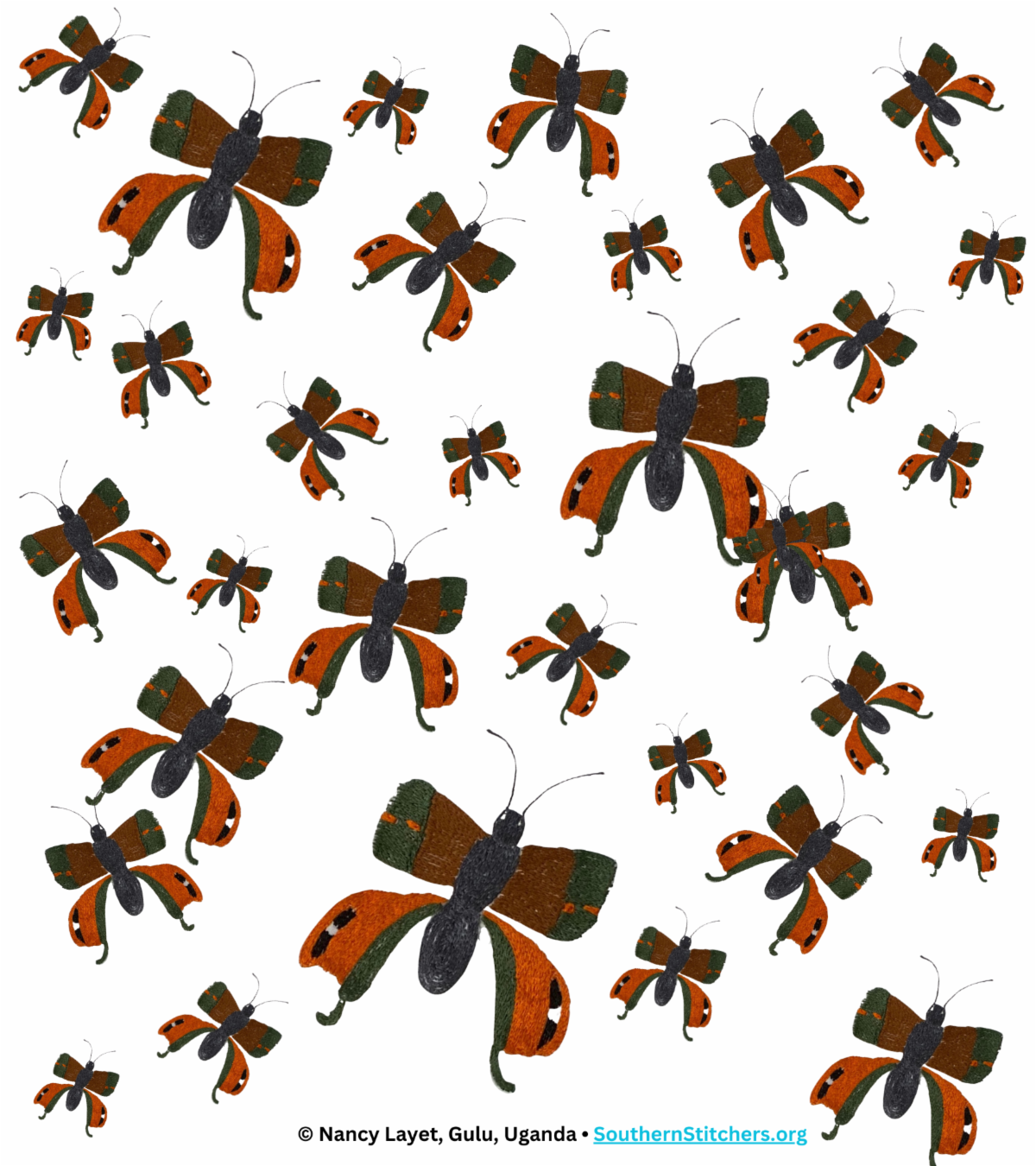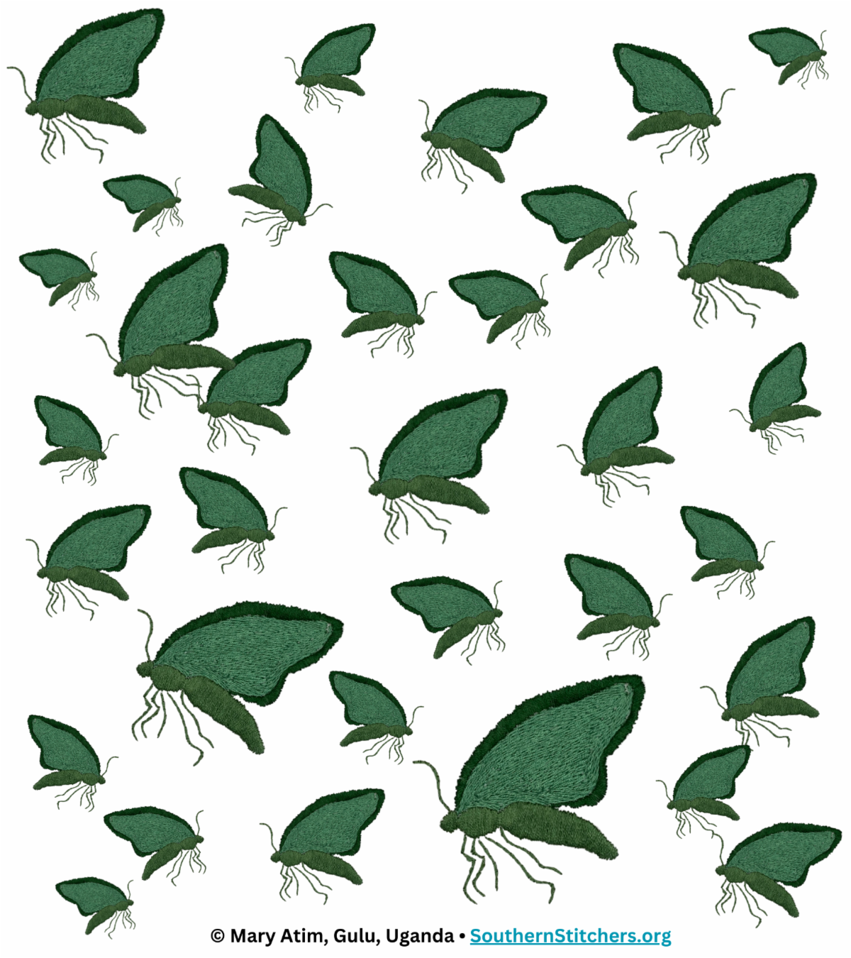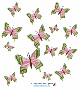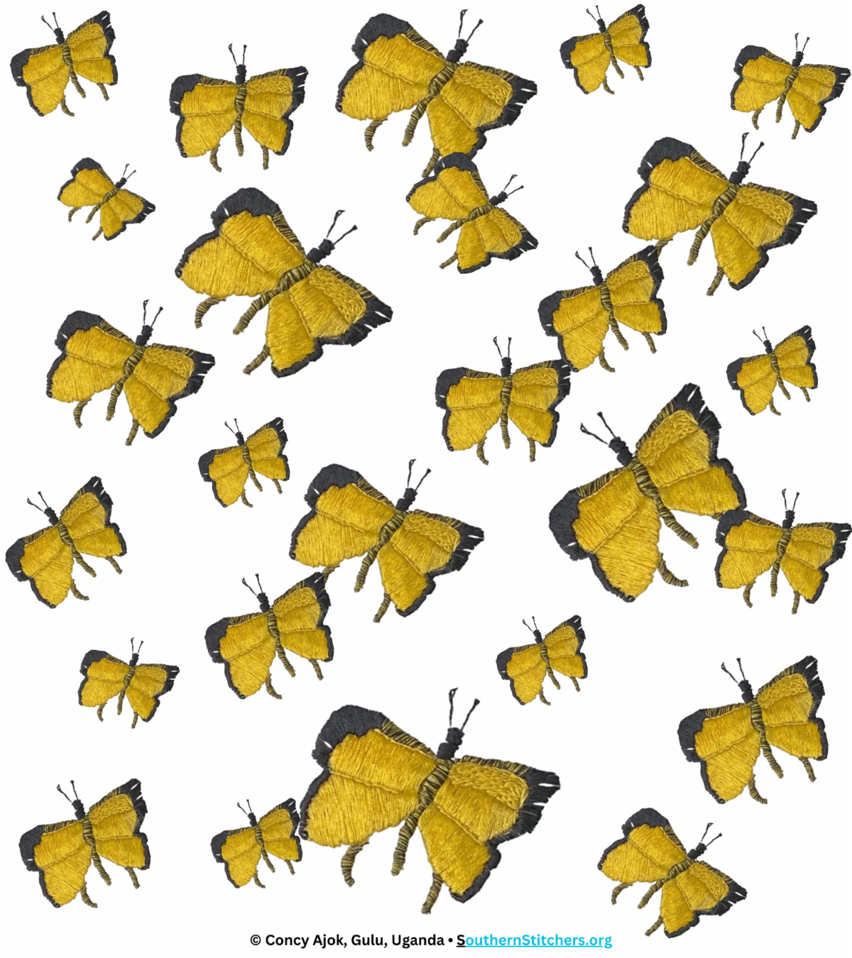 Nighty Achieng made the design for the Red butterfly tea towel, shown left. Nighty was kidnapped by rebels at the age of 11 and held captive for five years. She says that stitching has brought her closer to friends and offers a badly-need source of income.