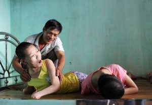Le Thanh Duc‘s three daughters were so incapacitated that Mr Duc had to move them to a new position every half hour. The three girls were unable to speak but communicated with each other through messages on their phones.