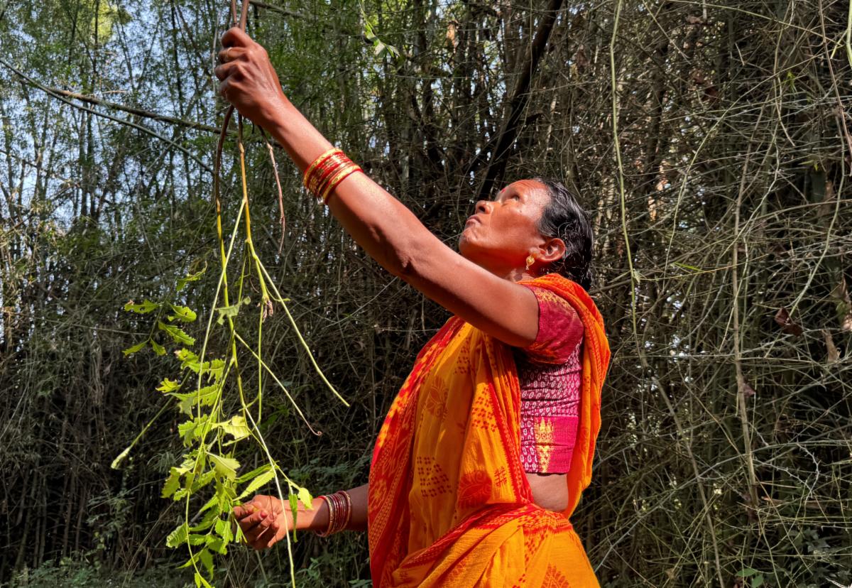 ![]() Pratima Jani, president of the Sundartaila women’s self-help group, collects leaves and bark from Neem trees near her house * |