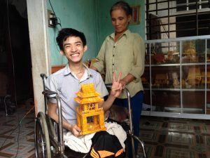 When I first visited Mr Xoan’s family in 2015, Tuan was in a wheelchair, making models out of discarded popsicle sticks as seen in the photo below. He had felt the onset of paralysis in his legs around the age of fifteen and dropped out of school after being bullied. Restless and talented, he turned to his popsicle sticks and was grateful when I purchased one of his models of the revered University of Hue.