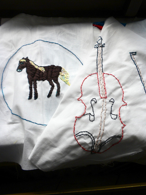 Žaneta Gazová The horse is integral to traditional nomadic Roma culture and a Žaneta displays one of her panels while holding her ten month-old son, David. The panel depicts a violin after the wedding of her sister-in-law and fellow quilter, Emilie Žigová. She says that although a violin is typically played by men, music should definitely be included among the quilt’s themes. The third panel, by Žaneta, depicts a Roma woman dancing in traditional dress. Žaneta was a dancer before the birth of her children and wanted to demonstrate the importance of dance in Roma culture. Although she no longer performs at festivals, she still dances at the wedding of her friends. Žaneta said that thinking of a design and turning it into embroidery has been a wonderful experience. She was often unable to work during the day, but worked on her panels after her young son David has gone to bed. (Any mother with a teething child knows how hard it can be to concentrate with an unhappy baby!) She describes the work as relaxing, particularly as it allowed her to spend more time with her other son, Dušan, who is 10 years old. She taught him how to embroider. He even lobbied to have his panels included in the quilt! Žaneta only got as far as Grade 9 in school. She says that she didn’t want to continue because it was so difficult to fit in with the non-Roma children. In addition, she said that she needed to make money rather than spend it on school. |
