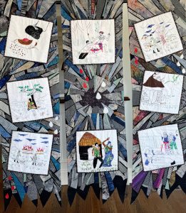 The blocks for this quilt were stitched by ten women in northern Uganda who were kidnapped during their teens and held in sexual slavery by rebels from the Lord’s Resistance Army (LRA). After escaping, the women formed an association, Women in Action for Women, and used stitching to regain their confidence and develop new skills. Peace Fellow Anna Braverman helped them describe their ordeal through embroidery in 2021. Their blocks were laid over a background of jagged broken glass by Anne Watson in North Carolina to depict the lacerating impact of sexual violence on victims.