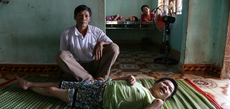 Mr. Le Thanh Duc sits with his daughter, Le Thi No (32 years old). No shares this bed with her sister, Le Thi Phuong (35 years old, not pictured).