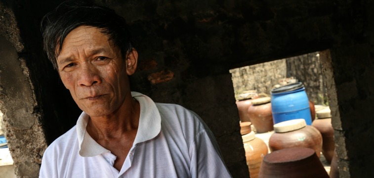 Mr. Duc is bursting to give us a tour of his business, which he runs with his sister, and he takes us down the path to a shed where it all happens. Oblivious to the smell, he tells us that AEPD loaned him 17 million Dong (through Irish Aid) in 2013, which he used to buy ten large pots and other equipment. Each year he borrows 10 million Dong to buy anchovies, which he stores in the pots for several months. It normally costs about 12 million Dong to fill the pots, but it cost almost double in 2014 because of the storms, which the Vietnamese put down to climate change. After a year of stewing, the fish sauce is ripe, ready and very strong. It is also very popular in restaurants.