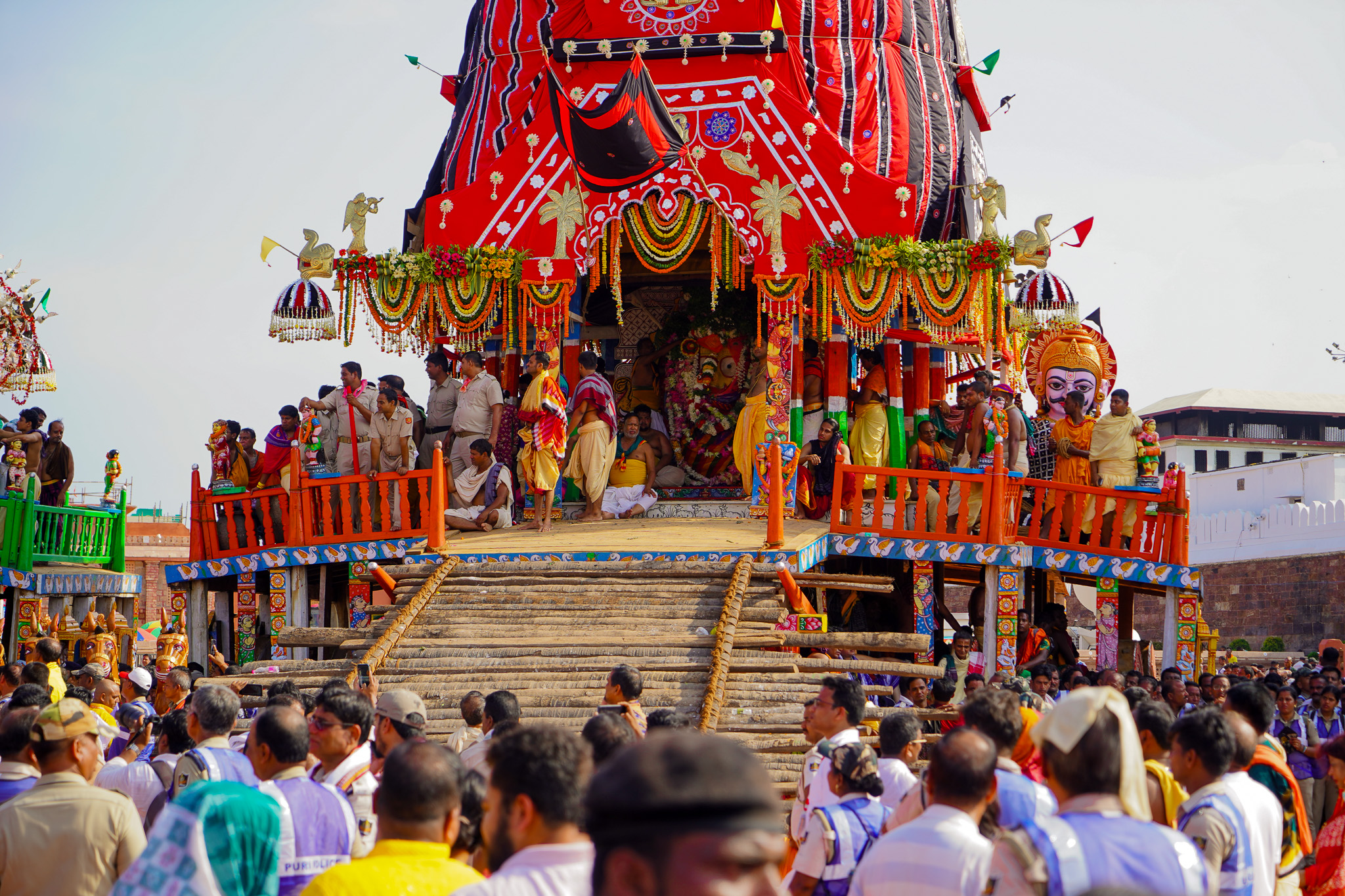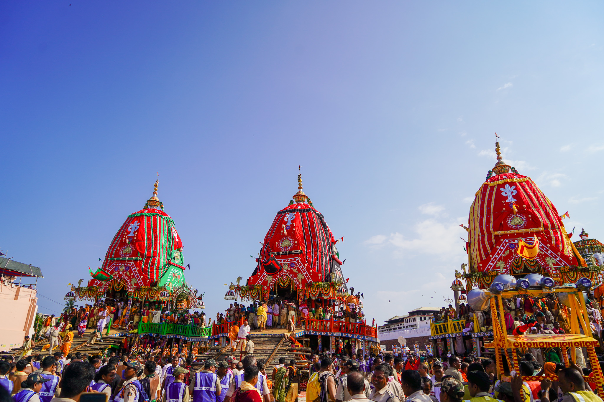 My VIP status afforded me a rare, up-close view. Each chariot, or ‘ratha’, is a wooden behemoth standing over 40 feet tall, crafted anew each year. The largest, Lord Jagannath’s Nandighosa chariot, boasts 16 wheels and is adorned with red and yellow fabric. Balabhadra’s Taladhwaja chariot, slightly smaller, is covered in red and green, while Subhadra’s Darpadalana is the smallest, draped in red and black.