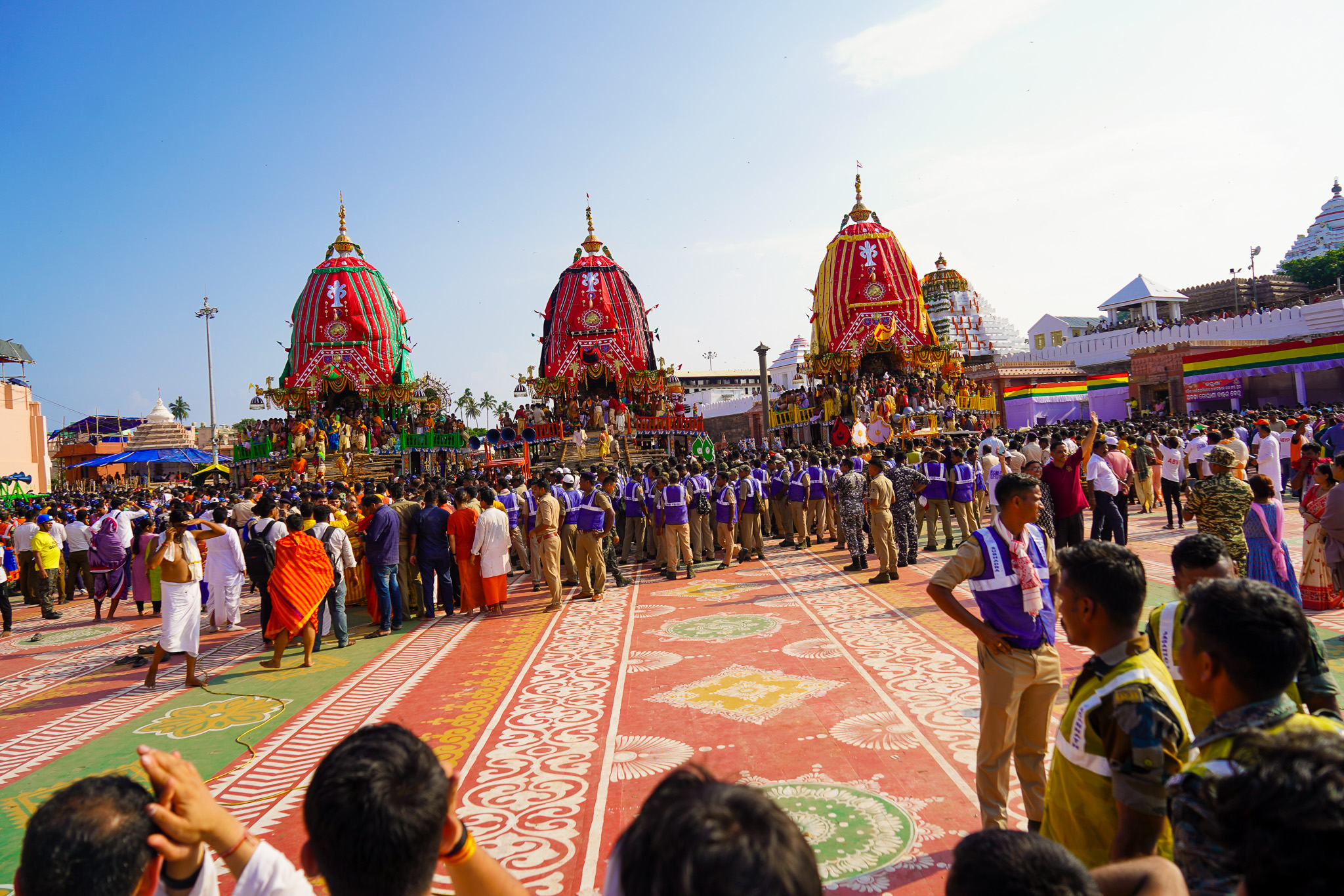 With space to move my legs, I made my way to the stage where the President of India was delivering a speech. Though I couldn’t understand the words, the crowd was clearly enthralled. However, my gaze was drawn to the true stars of the show: the three massive chariots.