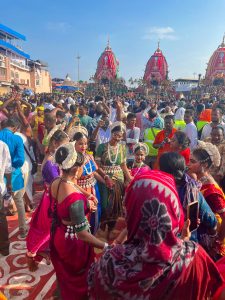 Within the cordoned area, I found myself in a microcosm of the festival. Reporters bustled about, while devotees danced and sang with joy. I joined with groups of people chanting “Hare Krishna” – a nod to Lord Jagannath’s connection to Krishna, of whom he’s considered an abstract representation. Groups of women also performed the traditional Odissi dance, their fluid movements reflecting age-told traditions. Others engaged in spontaneous expressions of devotion – spinning and leaping to the rhythm of drums and cymbals.