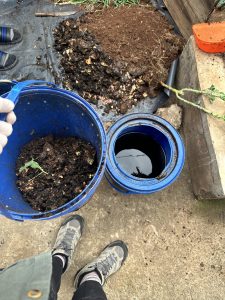 What’s left of Irene’s compost and worms after we divided out the organic matter. Lishe-grow sits on the bottom right. Irene’s old soil sits next to compost, ready to be mixed, in the background.