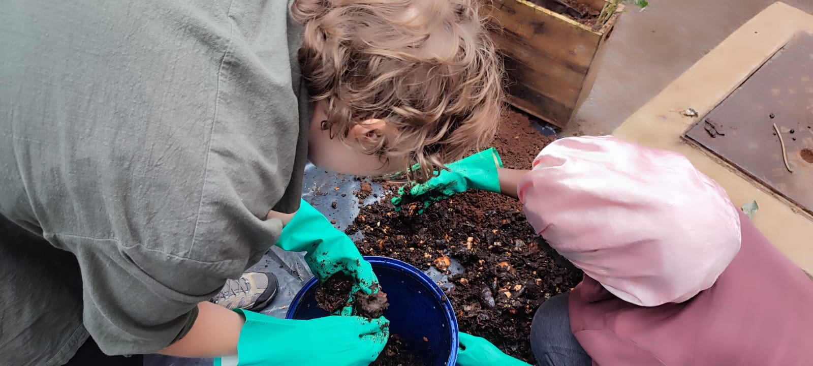 Irene and I sifting through the compost to divide the worms up from the organic matter used to replenish the soil.