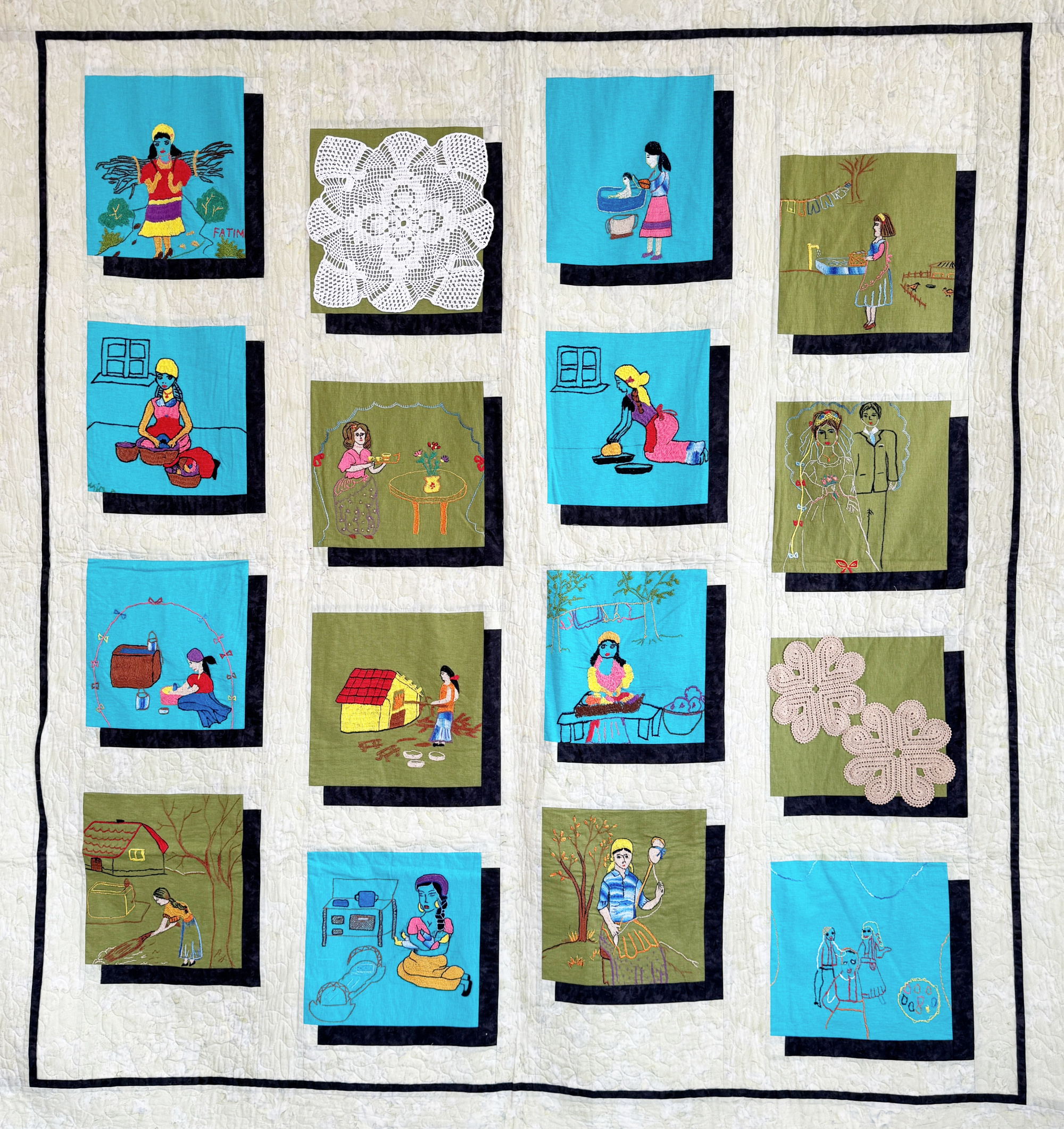 The blocks for this quilt were stitched by Roma artists near the town of Gracanica in Kosovo and described the traditional life of Roma women. The project was sponsored by Open Door, a Roma advocacy group, and organized by Peace Fellow Samantha Hammer. Farjia Mehmeti (left photo) led the stitching. The blocks were quilted by the Swan Lake Quilt Guild in South Carolina led by Bobbi Fitzsimmons and Sharon Sissons.