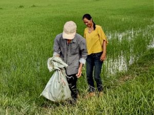 Over tea, the conversation turns to the shape of their days. Much of the family’s livelihood still depends on rice, with the cow as a new form of stability. In the afternoons, Thảo and Cảnh walk out to the fields together. She bends to cut grass while he steadies the sack, adjusting it as it grows heavy. The work is demanding, especially for Thảo with her health and for Cảnh at his age, yet they carry it out side by side, their movements practiced and unhurried. In watching them, what becomes evident is the familiarity of routine, the way daily labor and care fold into one another.